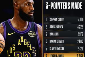 比赛第二节,詹姆斯命中两记三分,得到赛季首分,同时接连赶超雷吉·米勒,生涯三分数来到2561个,排在NBA历史第六。前五是:库里、哈登、雷·阿伦、利拉德、克莱(2729个)。