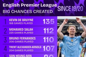 19-20赛季以来英超创造重大机会榜:德布劳内、萨拉赫、B费前三